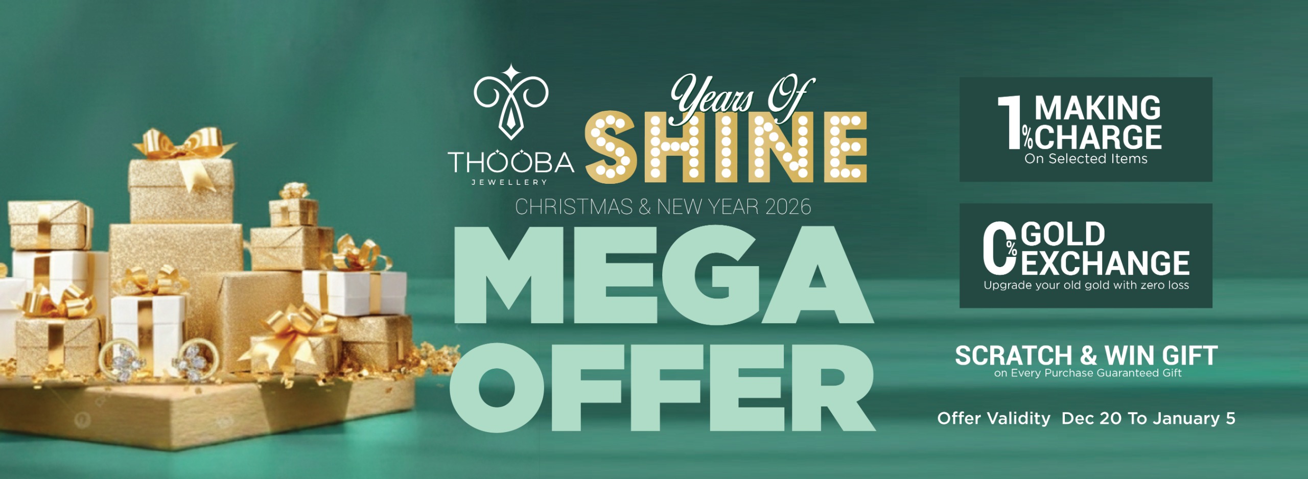 Welcome to Thooba Jewellery, where elegance meets tradition. With 40 years of experience in Malappuram's heart, Chemmad town, we offer a curated collection of gold, silver, and diamond jewellery crafted with precision and passion. Our name, inspired by the Arabic word for happiness, reflects our commitment to timeless beauty and joyous moments. Trust Thooba for quality craftsmanship, personalized service, and a legacy of creating treasured memories.
